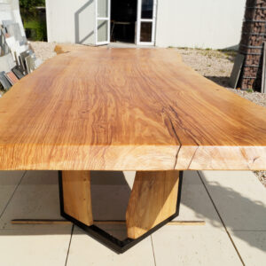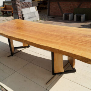 Stół z litego jesionu o naturalnych, surowych krawędziach z nogami wykonanymi z drewna i czarnego metalu. Wyraziste usłojenie i piękne, naturalne barwy drewna jesionowego – od jasnych delikatnych odcieni do miodowo-żółtych. Połączenie drewna i metalu w nogach nadaje industrialny charakter i daje pole do popisu przy aranżacji wnętrza. Ogromny, monolityczny blat wykonany z jednego kawałka drewna, o bardzo dużej powierzchni wystarczający, by spędzić przy nim czas w większym gronie. Sprawdzi się zarówno jako stół jadalniany do domu jak i stół konferencyjny do firmy, hotelu lub restauracji.