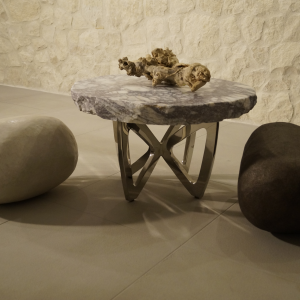 Okrągły blat z ciosaną krawędzią wykonaną z marmuru „Dark Purple Wave”