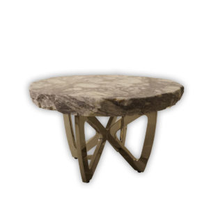 Blat wykonano z grubego marmuru w kształcie koła, połączonego z chromowanymi nogami.