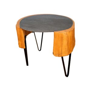 Wymiary: Szerokość: 63-67 cm Wysokość: 58 cm Materiał: Drewno: Topola Blat: Spiek kwarcowy „Pietra Di Savoia Grigia” Nogi: Stalowe, Czarne Produkt wykonywany jest z naturalnych...